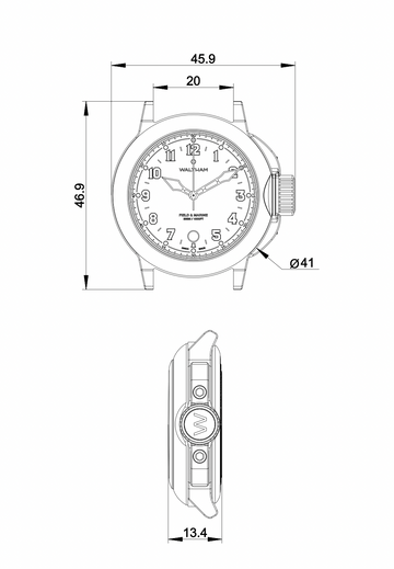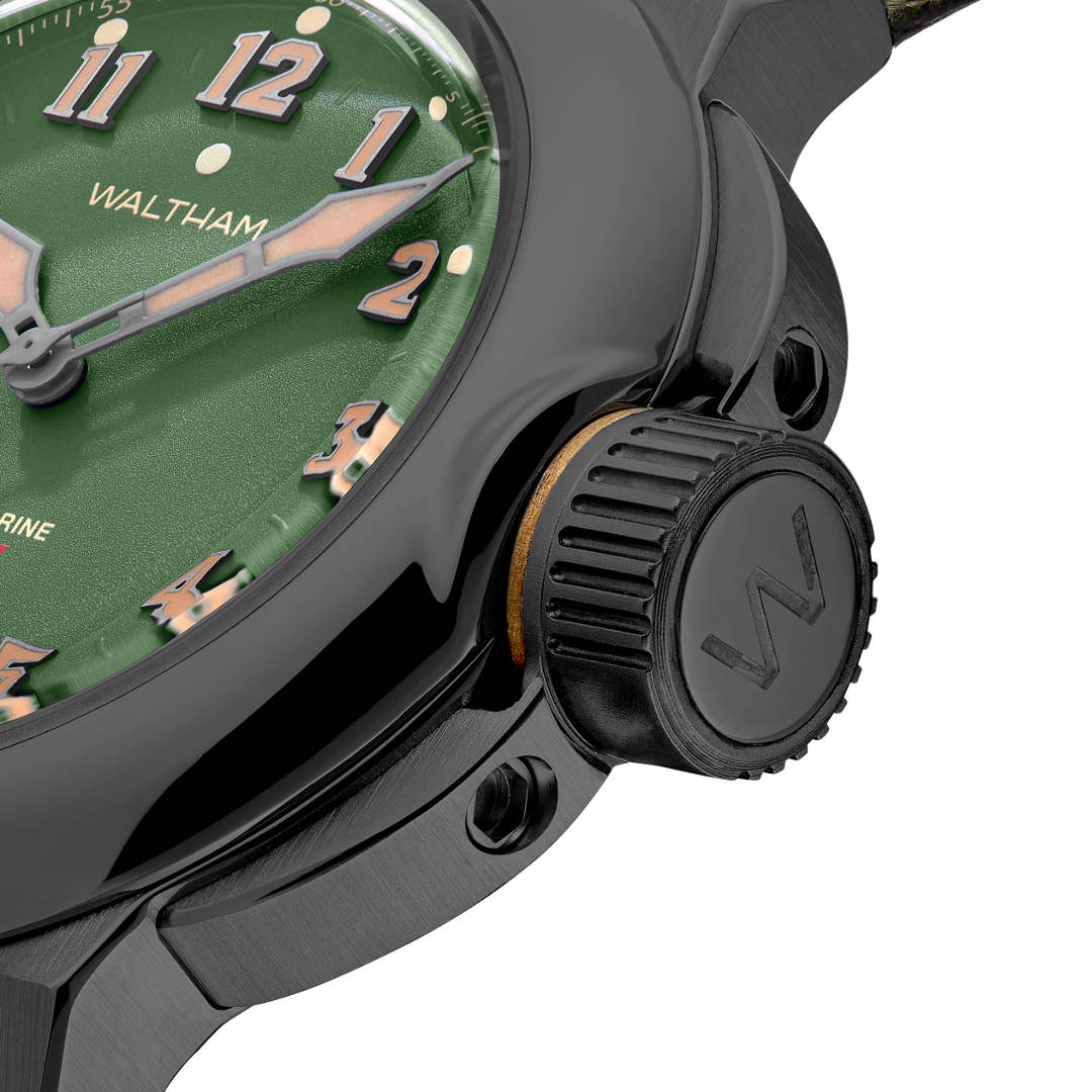 The design DNA of the Field & Marine is found in the crown and crown protection area. This area distinguishes the Field & Marine from any other watch. Historically, the bayonet crown, the screwed bezel, and the "compressor" case-back assured the water-resistance, making it the first waterproof wristwatch ever made. Today the Waltham Field & Marine is the only watch with a bayonet crown.